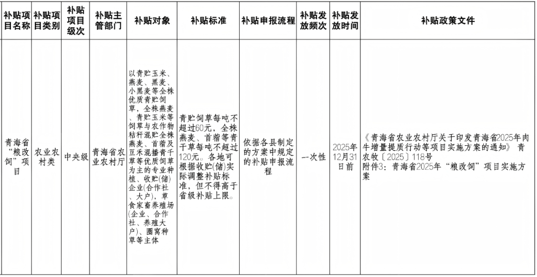 2015年以来,中央财政已连续安排资金支持青海省粮改饲项目工作。2020年,《国务院办公厅关于促进畜牧业高质量发展的意见》(〔2020〕31号)提出,要因地制宜推行粮改饲,增加青贮玉米种植,提高苜蓿、燕麦草等紧缺饲草自给率。