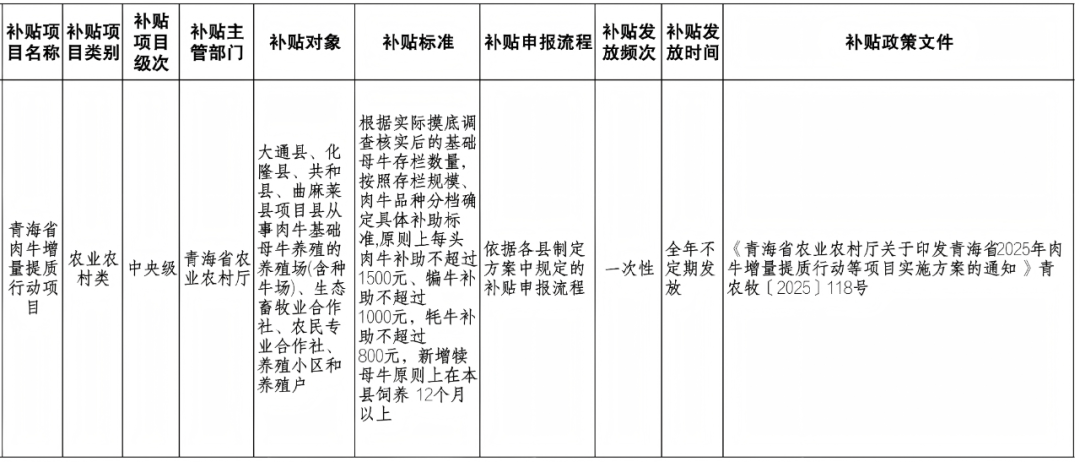 目前根据农业农村部安排和省级竞争遴选确定在大通县、化隆县、共和县、曲麻莱县实施。从事肉牛基础母牛养殖的养殖场(含种牛场)生态畜牧业合作社、农民专业合作社、养殖小区和养殖户。