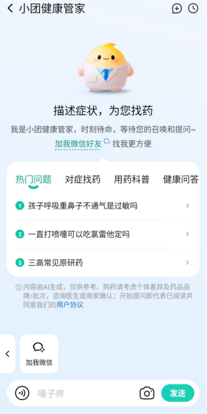 区别于市面上的通用AI健康问答产品,“小团健康管家”的关键差异在于“问完能做”——用户在对话中可跳转至线上购药、在线问诊或预约线下就医,实现从咨询到履约的完整闭环。目前该产品已接入微信渠道,后续将支持群聊接入。