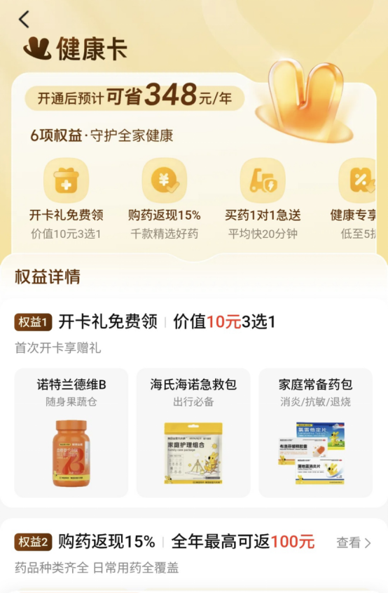 在本次大会上,美团医药健康还同步推出了“健康卡”付费会员服务。开卡用户可享受超过1000款药品购药返现15%的权益,返现可用于平台内消费或提现。这些药品覆盖过敏、流感、胃肠等家庭常备用药,及心脑血管等慢病用药等,其中原研药超过300款,包括玛巴洛沙韦片、替尔泊肽、莱博雷生等。