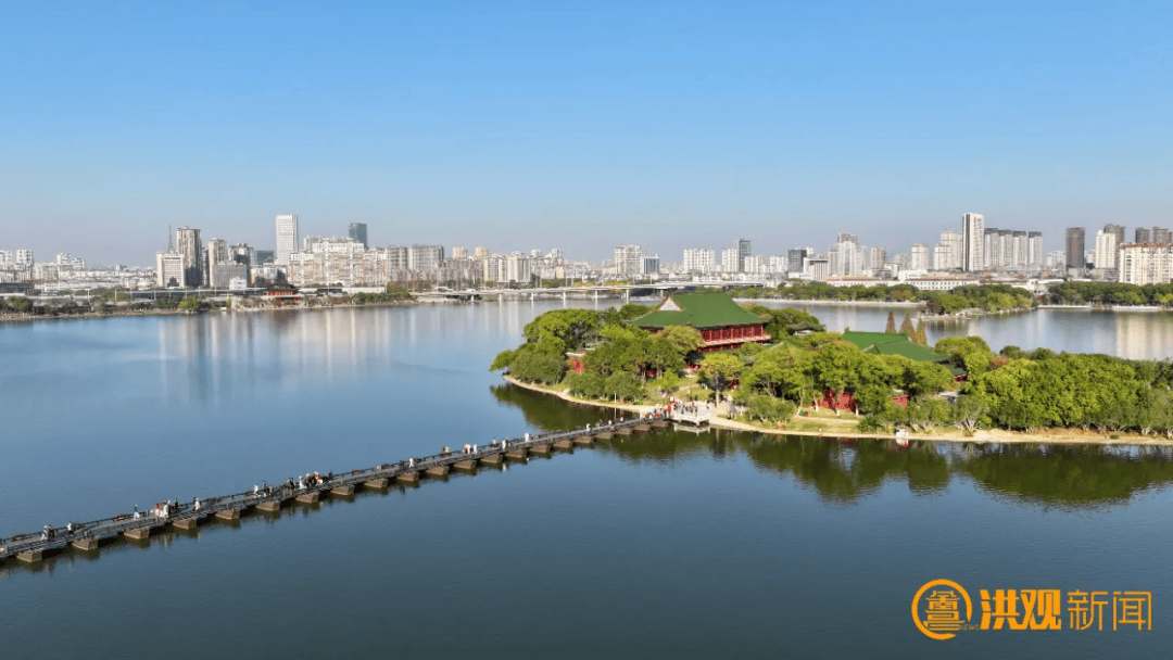 焕新归来的豫章书院,更是实现了千年文脉的活态复兴。2025年,南昌积极落实“江西书院”焕新计划,在风景秀丽的象湖风景区“复活”豫章书院,并把书院房屋修缮和游览步道工程建设项目列为十大民生实事之一,让这座有着800多年历史的古书院焕发时代光彩。一座全长202.8米、由39艘钢浮船拼接而成的“书院桥”,如古韵飘带连接西岸与湖心岛,形成“院在景中,景落岛内,岛于湖心”的诗意格局。同年9月28日,豫章书院焕新开放,市民游客在此临湖读书、研学明理,在墨香中触摸南昌千年文教底蕴,感受“物华天宝、人杰地灵”的豫章文化根脉。