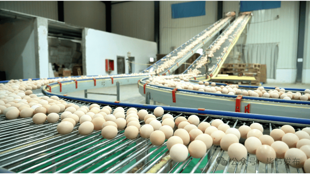 在七星关区撒拉溪镇的毕节盛园蛋业有限公司全自动蛋鸡养殖基地内,百万羽蛋鸡在恒温鸡舍中啄食饮水,一枚枚新鲜鸡蛋通过智能集蛋线滑入分拣台,工人快速装箱,准备发往"粤港澳大湾区"。曾以传统农业为主的山区,如今正依托蛋鸡产业加速转型,出山入“湾”。