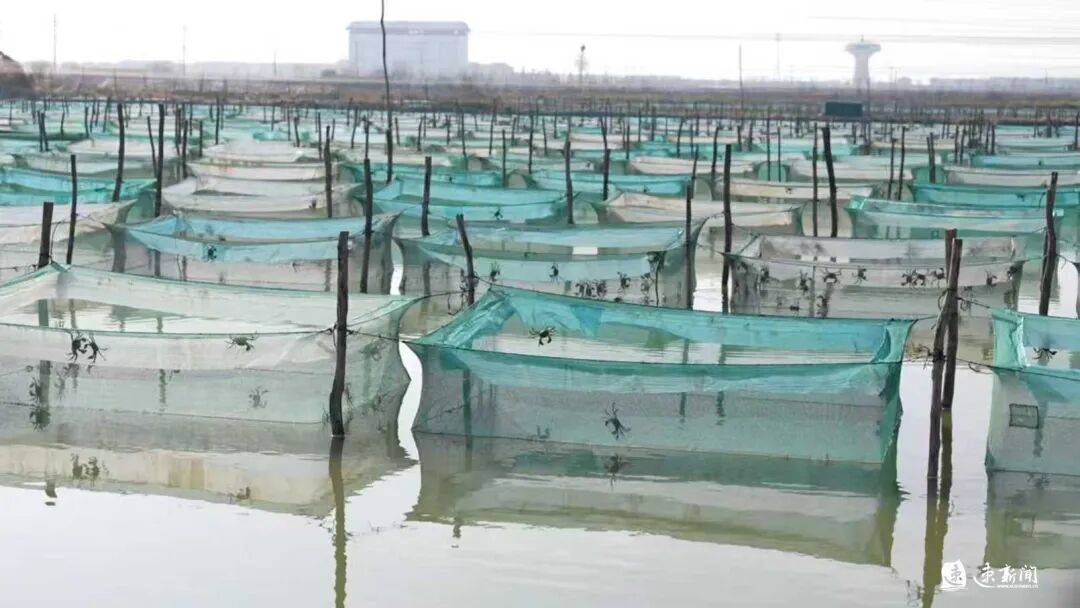 在塘中整齐排布的围网里,肥壮的“霸王蟹”正在“养精蓄锐”。刘永发随手捞起半筐,只见一只只螃蟹背甲青黑油亮,个个都有三四两重。“这些螃蟹到了春节销售旺季肯定能卖个好价钱,现在我们宿迁的螃蟹在外面可有名了!”他说。