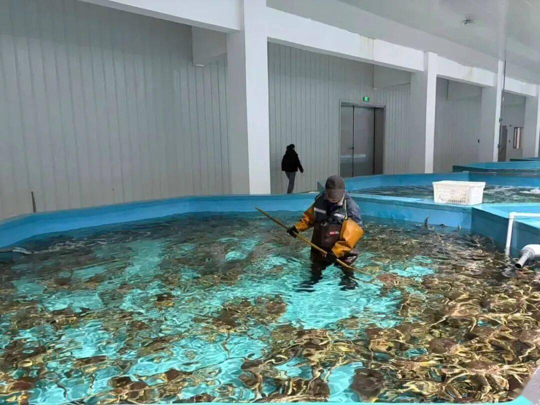 负责园区运营的这两年,他也变成了帝王蟹专家。帝王蟹是好斗的品种,它们经常会在海底相互打斗,导致断腿、缺腿。为此,暂养中心每天安排专人,穿着水鞋,带着蟹钩,在暂居池里寻找缺腿或奄奄一息的蟹,及时捞出它们,避免进一步损失。