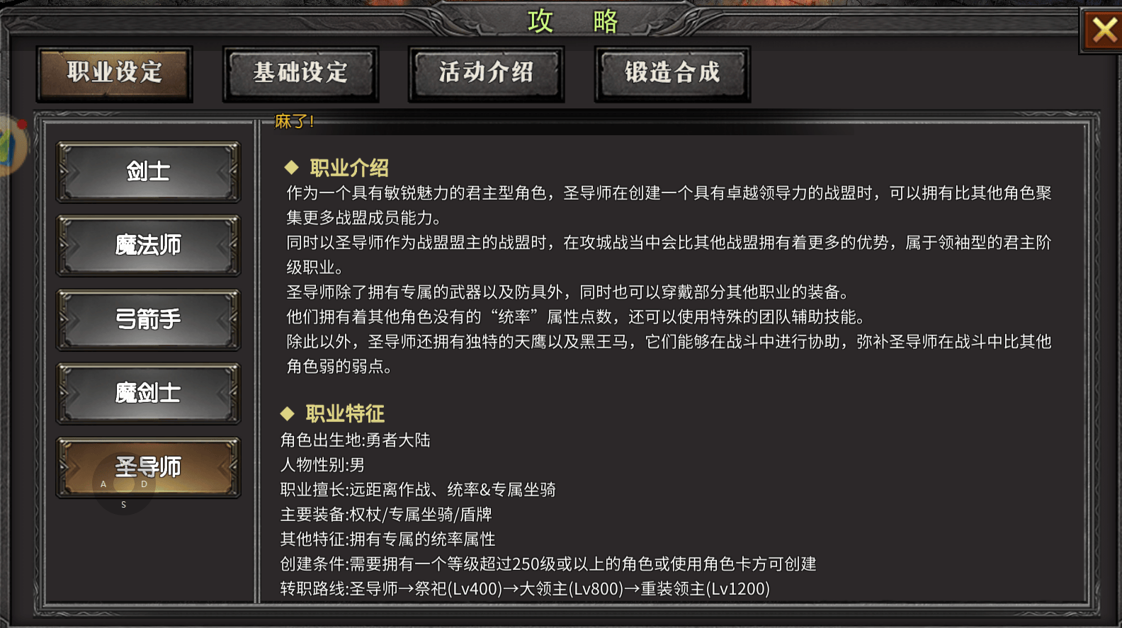 圣导师以“统率+专属坐骑”为核心特色,是唯一拥有“统率”属性的职业,创建需满足“拥有250级以上角色或使用角色卡”。定位为领袖型,创建战盟并担任盟主时,可通过统率属性提升战盟成员上限(最高80人),攻城战中拥有天然优势。核心助力来自专属伙伴天鹰与黑王马,可弥补自身战斗能力较弱的短板。养成核心围绕统率、智力与力量展开,适配场景:战盟管理、攻城战指挥、团队辅助增益,搬砖效率较低,适合以社交竞技为核心需求的玩家。